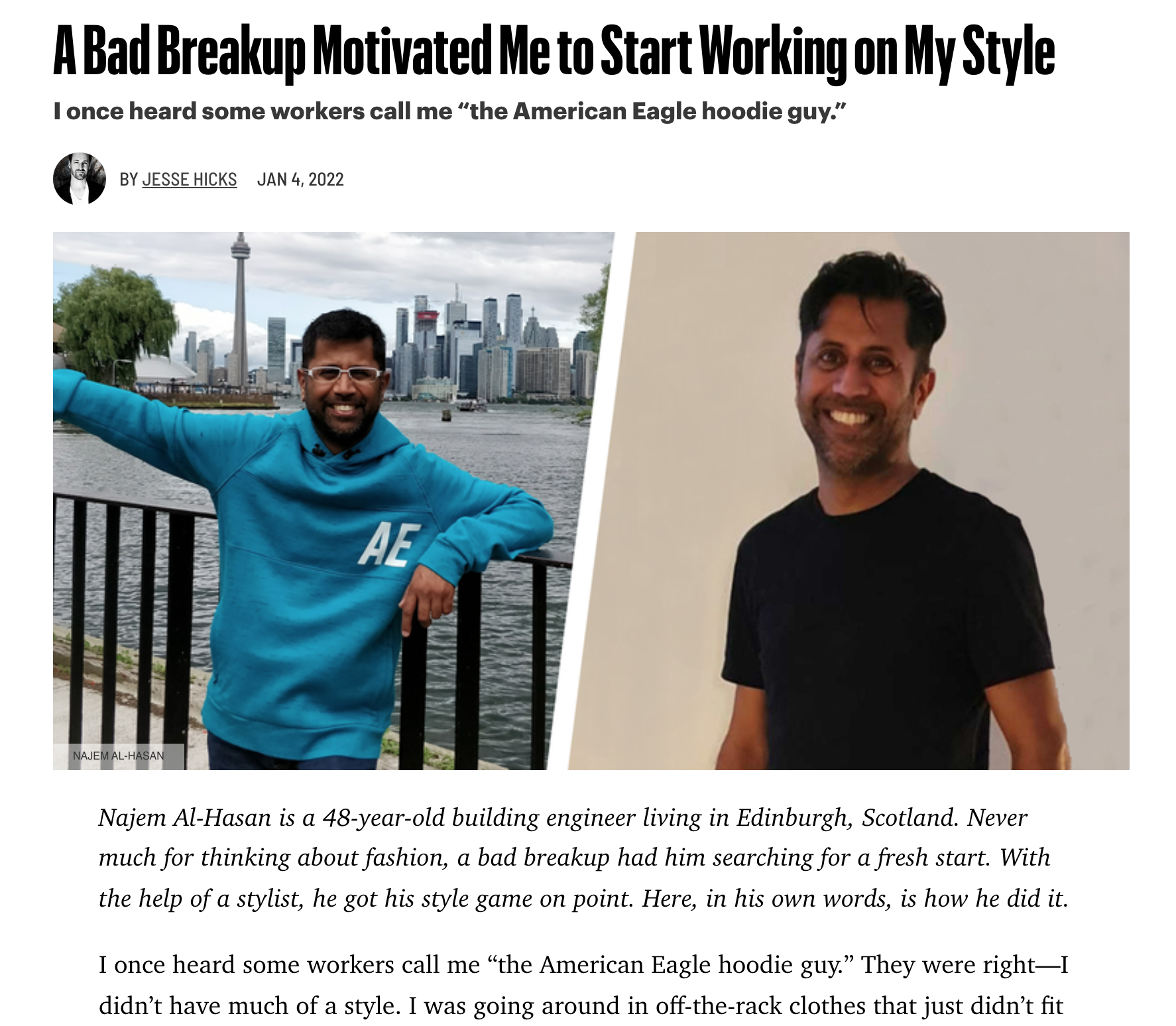 I normally don't share client work, but Men’s Health recently reached out and asked if I would share a client transformation. One of my guys, Najem, came to mind quickly. He’s been a pleasure to work with - helping him cultivate and improve his own unique sense of style (grooming & clothing). He's been implementing things incredibly well. Read the article on Men's Health to see more.